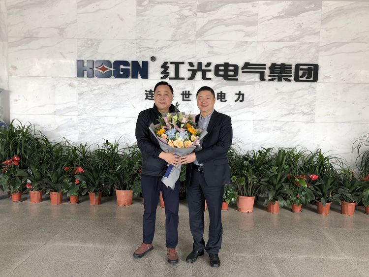 在公司一楼大厅,,,范晓东亲手给林中华送上“民营企业家节”定制鲜花,,,转达了市委向导班子对民营企业家的节日问候,,,并对pp电子电气集团多年来为乐清经济社会生长作出的卓越孝顺体现谢谢。。。。。。。