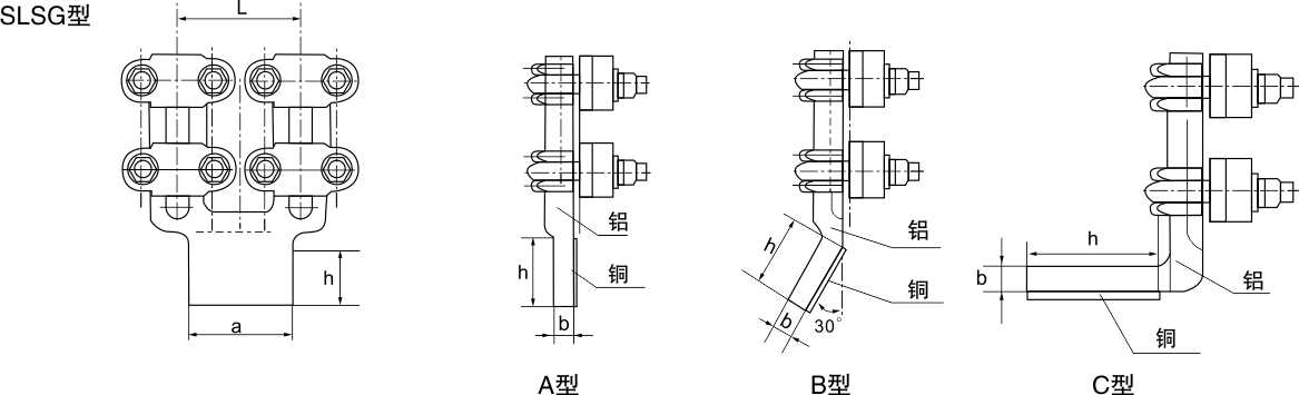 SLSG 螺栓型铜铝过渡双导线装备线夹(A为0°B为30°C为90°)